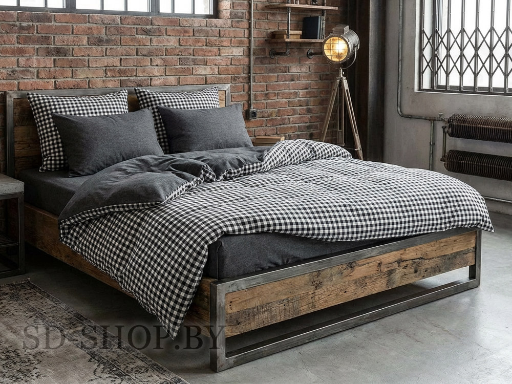 Постельное белье из Вареного хлопка "Черно-белая клетка + Серый меланж" 100% хлопок пр-во Барановичи (РБ).